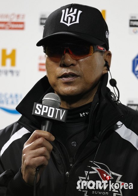 경기종료 후 시즌 11연패를 끊고 창단 첫 승을 거둔 kt 조범현 감독이 방송 인터뷰를 하고 있다.
