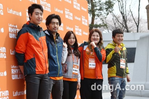 박민우(왼쪽부터), 오타니 료헤이, 허영지, 이국주, 조세호가 12일 오전 서울 남산 백범광장에서 열린 라푸마 트레일워킹화 ‘FX 제로-지(FX ZERO-G)’ 출시 기념 ‘2015 라푸마 리듬워킹’ 행사에 참석해 포토타임을 하고 있다.