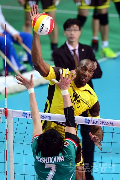 OK저축은행 시몬(가운데)이 12일 장충체육관에서 벌어진 ‘2015 한·일 V리그 탑매치’ JT(일본)와의 남자부 경기 도중 스파이크를 시도하고 있다. 장충|김진환 기자 kwangshin00@donga.com