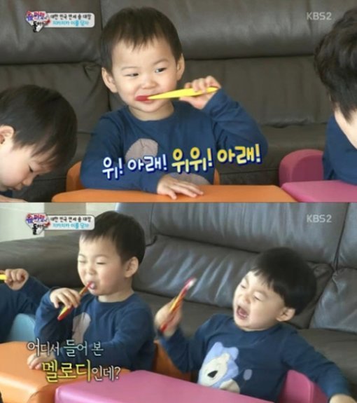 ‘슈퍼맨이 돌아왔다’에서 삼둥이들이 EXID의 ‘위아래’ 노래에 맞춰 양치질을 했다.