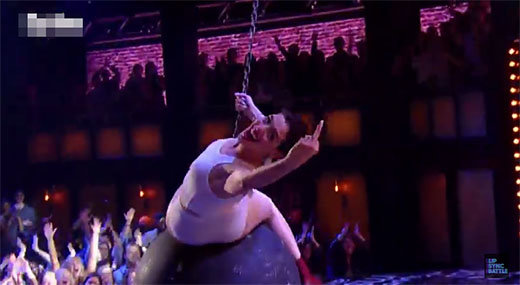이에 앤 해서웨이는 마일리 사이러스의 ‘레킹볼(Wrecking Ball)’을 선택했다. 트레이닝복 차림으로 등장한 앤 헤서웨이는 곧 바지를 찢어 던지고 하얀색 속옷만 입은 채 마이크를 핥는 등 마일리 사이러스의 파격 무대를 그대로 재현했다.