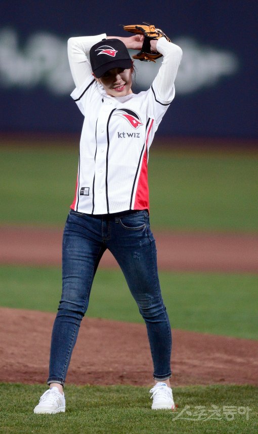 경기 전 KBS 경인방송 강려원 아나운서가 시구를 하고 있다.
