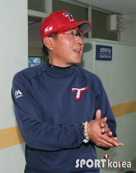 16일 오후 잠실야구장에서 열리는 ‘2015 타이어뱅크 KBO 리그 프로야구’ LG 트윈스 대 KIA 타이거즈 경기에 앞서 KIA 김기태 감독이 심판대기실을 찾아 지난 15일 경기에 있었던 심판과의 항쟁에 대해 오해를 푼 후 그라운드로 나가고 있다.