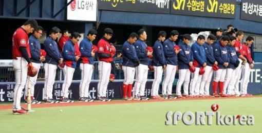16일 오후 잠실야구장에서 열린 ‘2015 타이어뱅크 KBO 리그 프로야구’ LG 트윈스 대 KIA 타이거즈 경기에 앞서 KIA 김기태 감독을 비롯한 선수단이 세월호 침몰 1주기를 맞아 애도의 묵념을 올리고 있다.