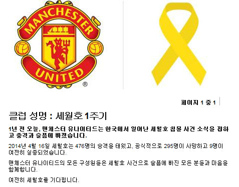 맨유는 굵은 글자로 “1년 전 오늘, 맨체스터 유나이티드는 한국에서 일어난 세월호 침몰 사건 소식을 접하고 충격과 슬픔에 빠졌습니다”라며 글의 화두를 열었다.