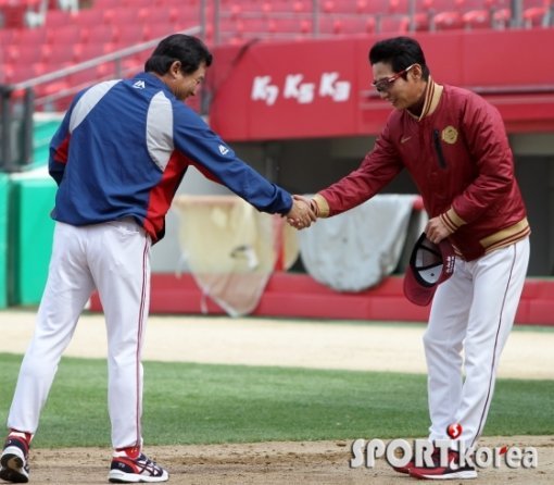 17일 오후 광주-기아챔피언스필드에서 열리는 ‘2015 타이어뱅크 KBO 리그 프로야구’ KIA 타이거즈와 넥센 히어로즈의 경기에 앞서 넥센 염경엽감독과 KIA 박흥식코치가 인사를 나누고 있다.