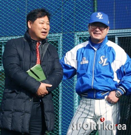 17일 오후 대구 시민야구장에서 열리는 ‘2015 타이어뱅크 KBO 리그 프로야구’ 삼성 라이온즈 대 kt 위즈 경기에 앞서 삼성 류중일 감독과 이만수 해설위원이 얘기를 나누고 있다.