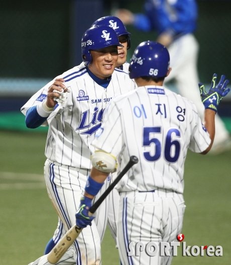 17일 오후 대구 시민야구장에서 열린 ‘2015 타이어뱅크 KBO 리그 프로야구’ 삼성 라이온즈 대 kt 위즈 경기 5회말 2사 2,3루에서 삼성 구자욱의 2타점 적시타로 홈을 밟은 2루주자 이승엽과 3루주자 박석민이 대기타석 이지영의 환영을 받고 있다.