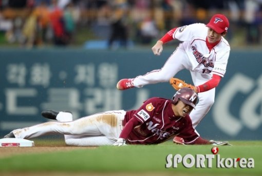 18일 오후 광주-기아챔피언스필드에서 열린 ‘2015 타이어뱅크 KBO 리그 프로야구’ KIA 타이거즈와 넥센 히어로즈의 경기 넥센 1회초 무사 1루에서 2번 김지수 타석 때 KIA 유격수 강한울이 2루도루를 시도하는 1루주자 고종욱을 태그아웃 시키고 있다.
