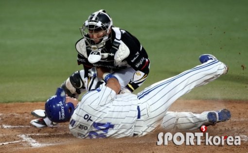 18일 오후 대구 시민야구장에서 열린 ‘2015 타이어뱅크 KBO 리그 프로야구’ 삼성 라이온즈 대 kt 위즈 경기 5회말 2사 2루에서 삼성 이승엽의 중전안타 때 홈으로 쇄도한 2루주자 최형우가 kt 포수 용덕한에게 태그아웃되고 있다 .