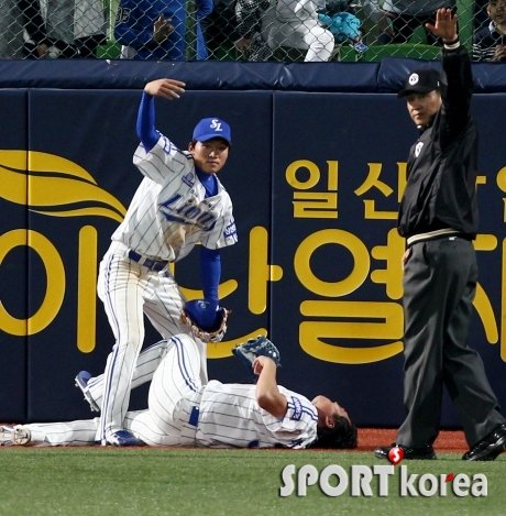 18일 오후 대구 시민야구장에서 열린 ‘2015 타이어뱅크 KBO 리그 프로야구’ 삼성 라이온즈 대 kt 위즈 경기 8회초 2사에서 삼성 우익수 박한이가 kt 박경수의 홈런성 타구를 잡아낸 후 부상을 당해 중견수 박해민이 의료진을 부르고 있다.
