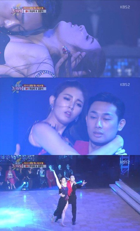 이날 방송에서 유승옥은 등 라인과 각선미가 드러나는 아찔한 의상을 입고 전 댄스스포츠 선수 김광식과 함께 이선희 '인연' 음악에 맞춰 룸바를 선보였다.