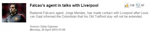 영국 ‘데일리 익스프레스’는 20일(이하 한국시각) “라다멜 팔카오의 에이전트 호르헤 멘데스가 리버풀과 협상 중”이라고 보도했다.