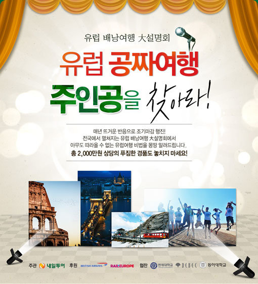 서울 연세대학교, 대구 대백플라자, 부산 동아대학교 부민캠퍼스에서 진행하며 참가신청은 내일투어 홈페이지에서 지역별 300명씩 선착순이다. 설명회에서는 유럽 배낭여행 준비 방법부터 현지에서 야간열차를 타는 팁까지 유럽여행의 ‘A to Z’를 설명하고 질의응답 시간을 갖는다. 설명회 참가자에게는 추첨을 통해 영국항공 유럽왕복항공권(지역별 1명씩, 150만원 상당), 유레일패스(지역별 1명씩, 130만원 상당), 알프스 티틀리스 등정권(지역별 4명씩, 13만원 상당) 등 총 2000만원 상당의 경품을 선물한다. 모든 참가자들에게 ‘아웃 오브 코리아’ 배낭여행 브로슈어 최신판, 네임택과 여권 커버, 각종 할인 쿠폰을 증정한다.
