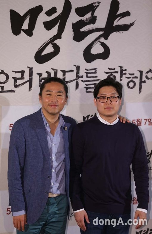 감독 김한민(왼쪽)과 정세교가 20일 오후 서울 왕십리 한 멀티플렉스에서 열린 영화 '명량: 회오리 바다를 향하여’ 언론시사회에 참석해 포토타임을 하고 있다.
