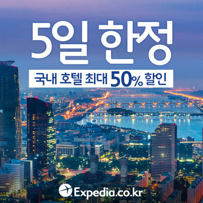 글로벌 온라인 여행사 익스피디아는 서울, 부산, 제주 등 국내 6개 도시 56개 호텔을 5일간 최대 50% 할인된 가격으로 이용하는 프로모션을 실시한다. 예약기간은 4월 25일까지이며 사용기간은 5월 31일까지다.