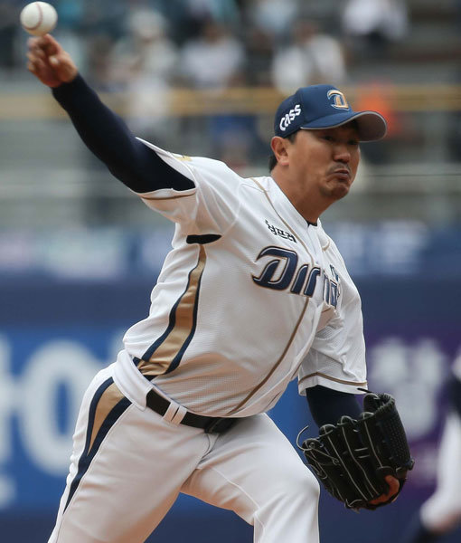NC 손민한(40)은 20일까지 규정이닝을 던진 32명의 투수 중 이닝당 최소 투구수에서 1위에 올랐다. 이닝당 13.84구를 던져 2위 윤희상(SK·15.26구)보다도 훨씬 효율적이었다. 손민한이 올 시즌 4경기에서 평균 5.2이닝을 소화했으니, 경기당 80.8구로 거의 6이닝을 책임진 것이다.