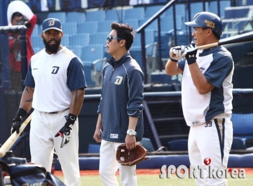 2일 오후 마산 야구장에서 열린 ‘2015 타이어뱅크 KBO 리그’ NC 다이노스와 삼성 라이온즈 경기에 앞서 NC 테임즈가 훈련 중 이종욱을 바라보고 있다.