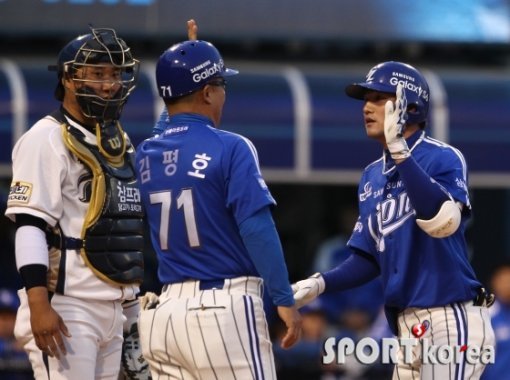 22일 오후 마산 야구장에서 열린 ‘2015 타이어뱅크 KBO 리그’ NC 다이노스와 삼성 라이온즈 경기 2회초 1사에서 삼성 김상수가 솔로포를 쏘아올린 후 홈인해 김평호 1루코치와 하이파이브를 하고 있다.