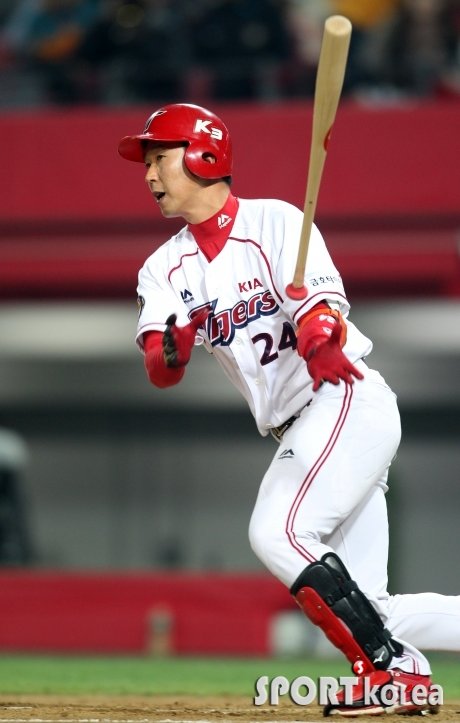 22일 오후 광주-기아챔피언스필드에서 열린 ‘2015 타이어뱅크 KBO 리그 프로야구’ KIA 타이거즈와 롯데 자이언츠의 경기에서 KIA 7번타자 김다원이 7회말 선두타자로 나와 3루수 옆을 뚫는 2루타를 날리고 있다.