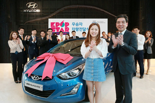 현대자동차(주)는 21일 현대차 국내영업본부 사옥(서울시 강남구 소재)에서 장재훈 전무 등 임직원 50여명이 참석한 가운데 ‘K-POP STAR 시즌4’의 우승자 케이티 김(23)에게 아반떼를 전달했다.
