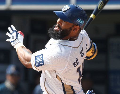 NC 에릭 테임즈는 극단적으로 당겨 치는 스타일이다. 삼성은 테임즈가 타석에 들어서면 유격수 김상수를 2루 뒤로 옮기는 등 수비수 전체를 오른쪽으로 이동하는 수비 시프트를 구사하며 테임즈를 압박하고 있다. 사진제공|스포츠코리아