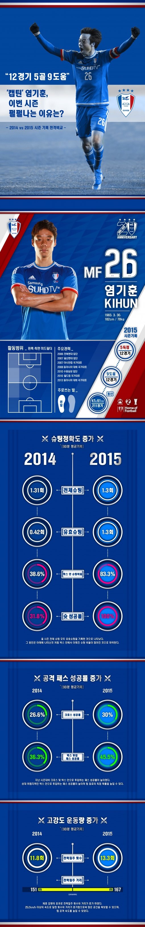 스포츠영상 전문분석기업인 (주)비주얼스포츠(대표 김창훈)는 염기훈이 출전한 2014년도와 2015년도 K리그 경기들을 분석하여 최근 염기훈이 펄펄 나는 이유에 대해 분석하였다.