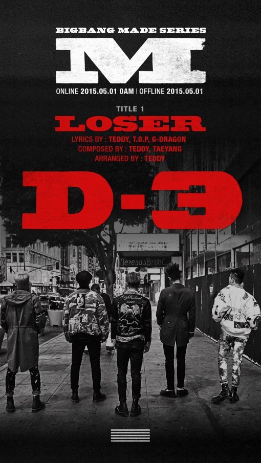 흑백 사진으로 된 이번 포스터에는 도심 속 길거리에 서있는 빅뱅 다섯 멤버의 뒷모습이 담겨있어 궁금증을 자아냈다. 이와 함께 강렬한 빨간색으로 ‘TITLE 1 LOSER’, ‘LYRICS BY: TEDDY, T.O.P, G-DRAGON, COMPOSED BY: TEDDY, TAEYANG, ARRANGED BY: TEDDY’라는 문구가 쓰여있어 첫 번째 타이틀곡 ‘LOSER’의 작사에 YG를 대표하는 프로듀서 테디, 탑 그리고 지드래곤, 작곡에 테디와 태양, 편곡에는 테디가 참여했음을 알렸다.
