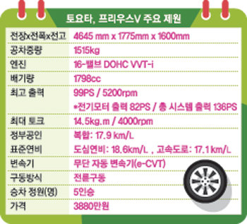 프리우스는 해치백 스타일의 중형 승용차로 뛰어난 연비(21.0 km/L)가 최대 강점이었다. 유일한 단점은 4인 가족이 주말 레저나 여행을 편하게 즐기기에는 다소 좁다는 점이었다.