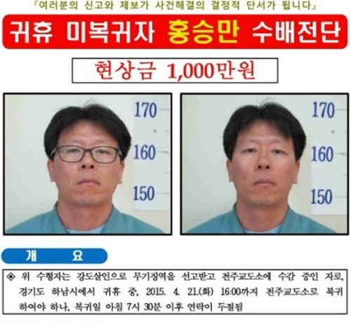 앞서 전주교도소는 24일 오전 8시를 기해 귀휴 미복귀자 홍승만에 대해 현상금 1000만 원을 걸고 현상수배에 나섰다.
