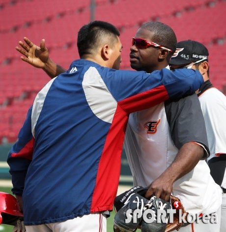 29일 오후 광주-기아챔피언스필드에서 열린는 ‘2015 타이어뱅크 KBO 리그 프로야구’ KIA 타이거즈와 한화 이글스의 경기에 앞서 KIA 최희섭이 한화 유먼과 인사를 나누고 있다.