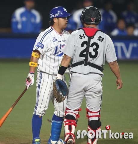 29일 오후 대구 시민야구장에서 열린 ‘2015 타이어뱅크 KBO 리그 프로야구’ 삼성 라이온즈 대 LG 트윈스 경기 3회말 무사 1루에서 삼성 박석민이 LG 선발 루카스의 볼에 맞은 후 흥분된 마음을 가다듬고 있다.