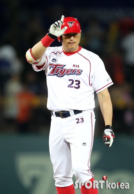 29일 오후 광주-기아챔피언스필드에서 열린 ‘2015 타이어뱅크 KBO 리그 프로야구’ KIA 타이거즈와 한화 이글스의 경기 KIA 5번 최희섭이 4회말 1사 1,2루 때 1타점 좌월 2루타를 치고 1루의 김태룡코치에게 세레모니를 보내고 있다.