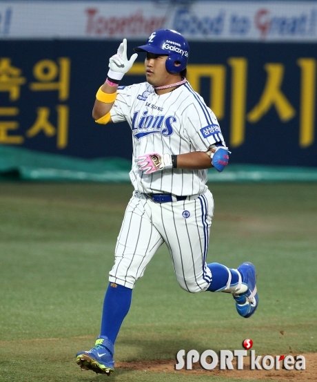 29일 오후 대구 시민야구장에서 열린 ‘2015 타이어뱅크 KBO 리그 프로야구’ 삼성 라이온즈 대 LG 트윈스 경기 1회말 2사 2루에서 삼성 박석민이 투런홈런을 친 후 그라운드를 돌며 환호하고 있다.