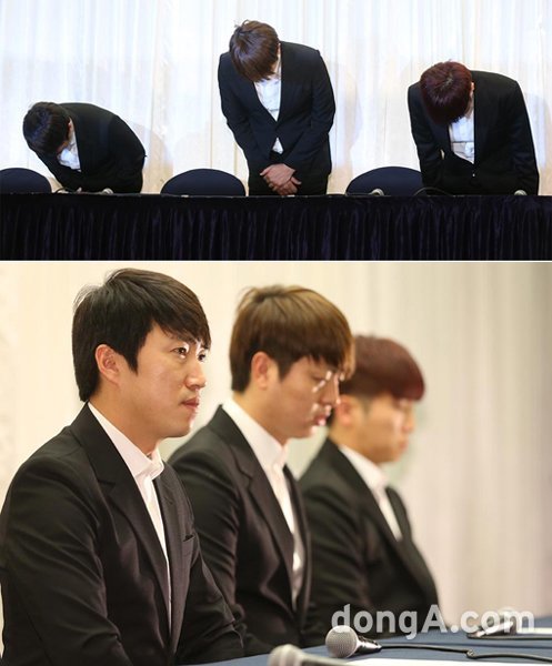 개그맨 장동민과 유상무, 유세윤(왼쪽부터)이 28일 기자회견을 열고 여성비하 발언 등에 대해 사과했다. “용서해주는 그날까지 속죄하겠다”며 고개를 숙이고 있다. 동아닷컴DB