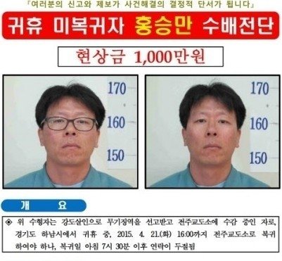 앞서 홍씨는 강도살인죄로 무기형을 선고받고 전주 교도소에 복역하던 중 사회적응 차원에서 17일 경기도 하남으로 귀휴를 나갔다가 복귀일인 지난 21일 오전 서울에서 잠적했다.