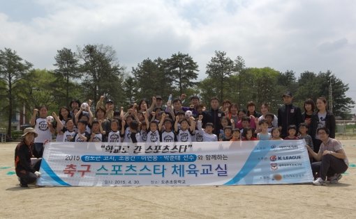 김도근 코치와 조동건, 이현웅, 박준태는 30일 ‘2014 스포츠스타 체육교실’(‘2014’는 주관 단체 ‘대한체육회’에서 결정한 공식 사업 명칭) 의 일환으로 봉화군 도촌초등학교를 찾아 학생들과 즐거운 추억을 공유했다.