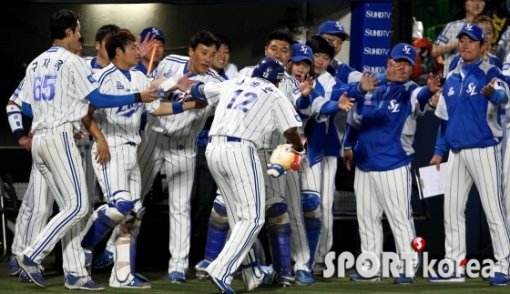 30일 오후 대구 시민야구장에서 열린 ‘2015 타이어뱅크 KBO 리그 프로야구’ 삼성 라이온즈 대 LG 트윈스 경기 3회말 1사에서 삼성 나바로가 솔로홈런을 쳐 홈을 밟은 후 덕아웃 동료선수들의 환영을 받고 있다.