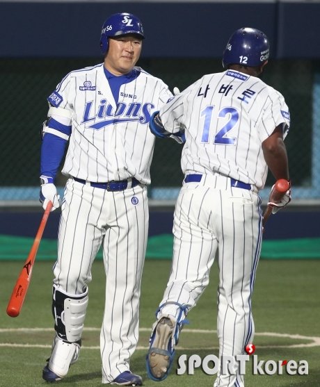 30일 오후 대구 시민야구장에서 열린 ‘2015 타이어뱅크 KBO 리그 프로야구’ 삼성 라이온즈 대 LG 트윈스 경기 3회말 1사에서 삼성 나바로가 솔로홈런을 쳐 홈을 밟은 후 다음 타석에서 홈런을 친 최형우와 하이파이브를 하고 있다.