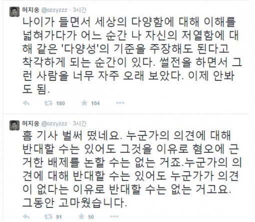 허지웅은 30일 자신의 SNS에 “내 저열함에 대해 ‘다양성’의 기준을 주장해도 된다고 착각하게 되는 순간이 있다. 썰전을 하면서 그런 사람을 너무 자주 오래 보았다”며 JTBC ‘썰전’ 하차 소감을 알렸다.