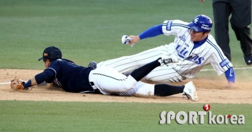 1일 오후 대구 시민야구장에서 열린 ‘2015 타이어뱅크 KBO 리그 프로야구’ 삼성 라이온즈 대 두산 베어스 경기 1회말 1사 2루에서 삼성 박석민의 내야안타 때 2루주자 최형우가 3루에서 세이프되고 있다.