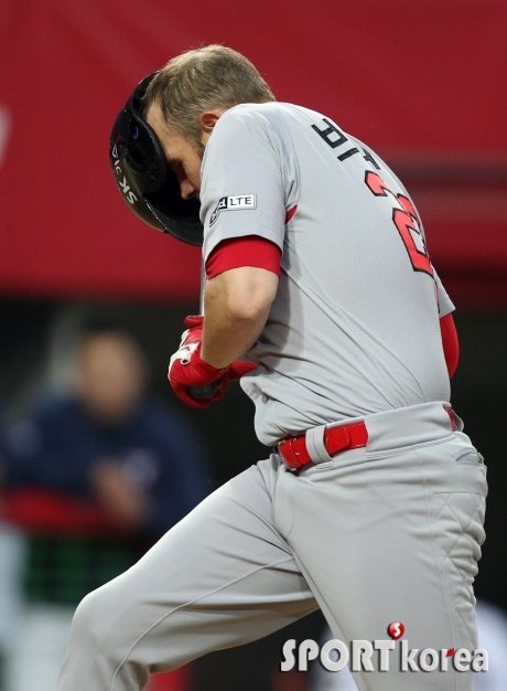 1일 오후 광주-기아챔피언스필드에서 열린 ‘2015 타이어뱅크 KBO 리그 프로야구’ KIA 타이거즈와 SK 와이번스의 경기에서 1회초 첫 타석에서 홈런을 친 SK 4번 브라운이 3회초 두번째 타석에서 KIA 스틴슨의 투구에 맞으며 헬멧이 벗겨지고 있다.