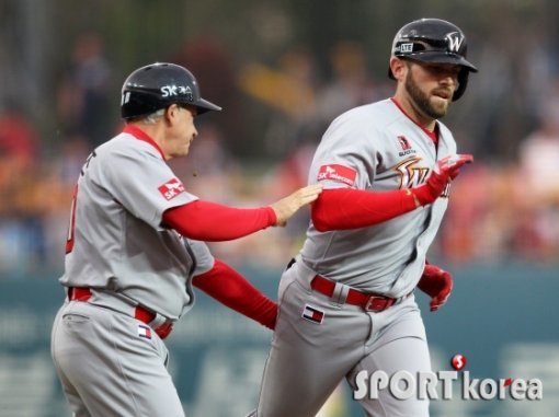 1일 오후 광주-기아챔피언스필드에서 열린 ‘2015 타이어뱅크 KBO 리그 프로야구’ KIA 타이거즈와 SK 와이번스의 경기 SK 1회초 2사 1루에서 4번 브라운이 비거리 125미터 좌중월 투런홈런을 치고 3루베이스를 돌며 알바레즈 코치의 환영을 받고 있다.
