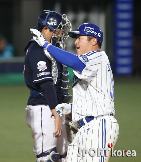 1일 오후 대구 시민야구장에서 열린 ‘2015 타이어뱅크 KBO 리그 프로야구’ 삼성 라이온즈 대 두산 베어스 경기 2회말 2사 2루에서 삼성 최형우가 투런홈런을 쳐 홈을 밟은 후 환호하고 있다.