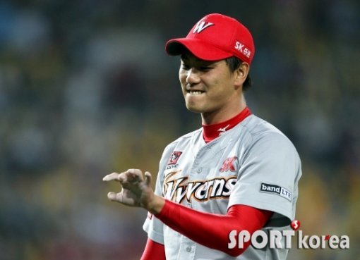 1일 오후 광주-기아챔피언스필드에서 열린 ‘2015 타이어뱅크 KBO 리그 프로야구’ KIA 타이거즈와 SK 와이번스의 경기에서 SK 선발 김광현이 이닝을 마치고 덕아웃으로 향하고 있다.