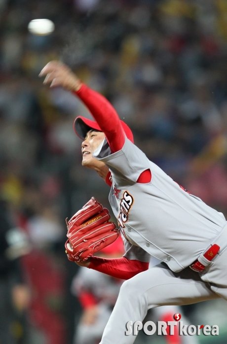 1일 오후 광주-기아챔피언스필드에서 열린 ‘2015 타이어뱅크 KBO 리그 프로야구’ KIA 타이거즈와 SK 와이번스의 경기에서 SK 선발 김광현이 투구하고 있다.