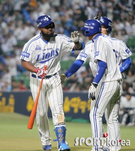 1일 오후 대구 시민야구장에서 열린 ‘2015 타이어뱅크 KBO 리그 프로야구’ 삼성 라이온즈 대 두산 베어스 경기 8회말 무사 1,2루에서 삼성 나바로가 스리런을 쳐 홈을 밟은 후 선행주자 김상수, 이영욱의 환영을 받고 있다.