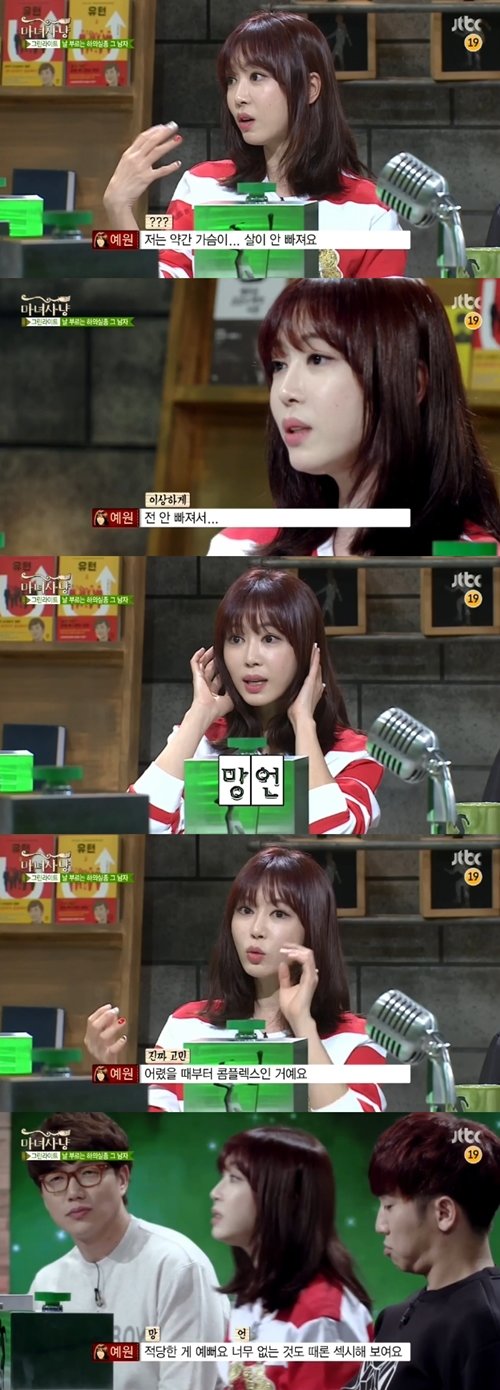 강예원은 1일 방송된 JTBC ‘마녀사냥’에서 “가슴 사이즈가 고민이다. 남들은 가슴 살이 빠져서 고민이라는데 나는 안 빠지더라”고 말했다.