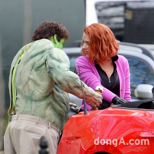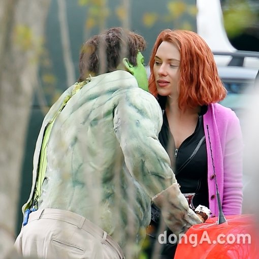 사진 속 스칼렛 요한슨은 ‘어벤져스’ 시리즈의 ‘블랙 위도우’ 머리 스타일을 한 채 ‘헐크’로 분장한 영화배우이자 코미디언인 바비 모니한과 촬영에 임하고 있다.
