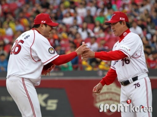 2일 광주-기아챔피언스필드에서 열린 ‘2015 타이어뱅크 KBO 리그 프로야구’ KIA 타이거즈와 SK 와이번스의 경기에서 KIA 선발 서재응이 6회초 1사 2루 3번 최정타석 때 마운드에서 물러나며 조계현 코치의 격려를 받고 있다.